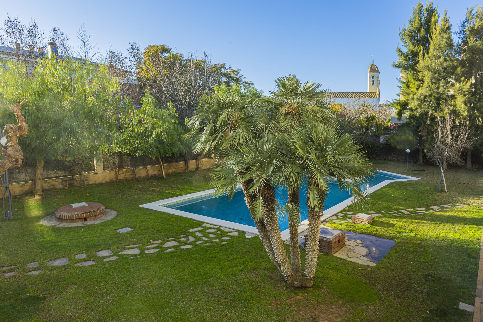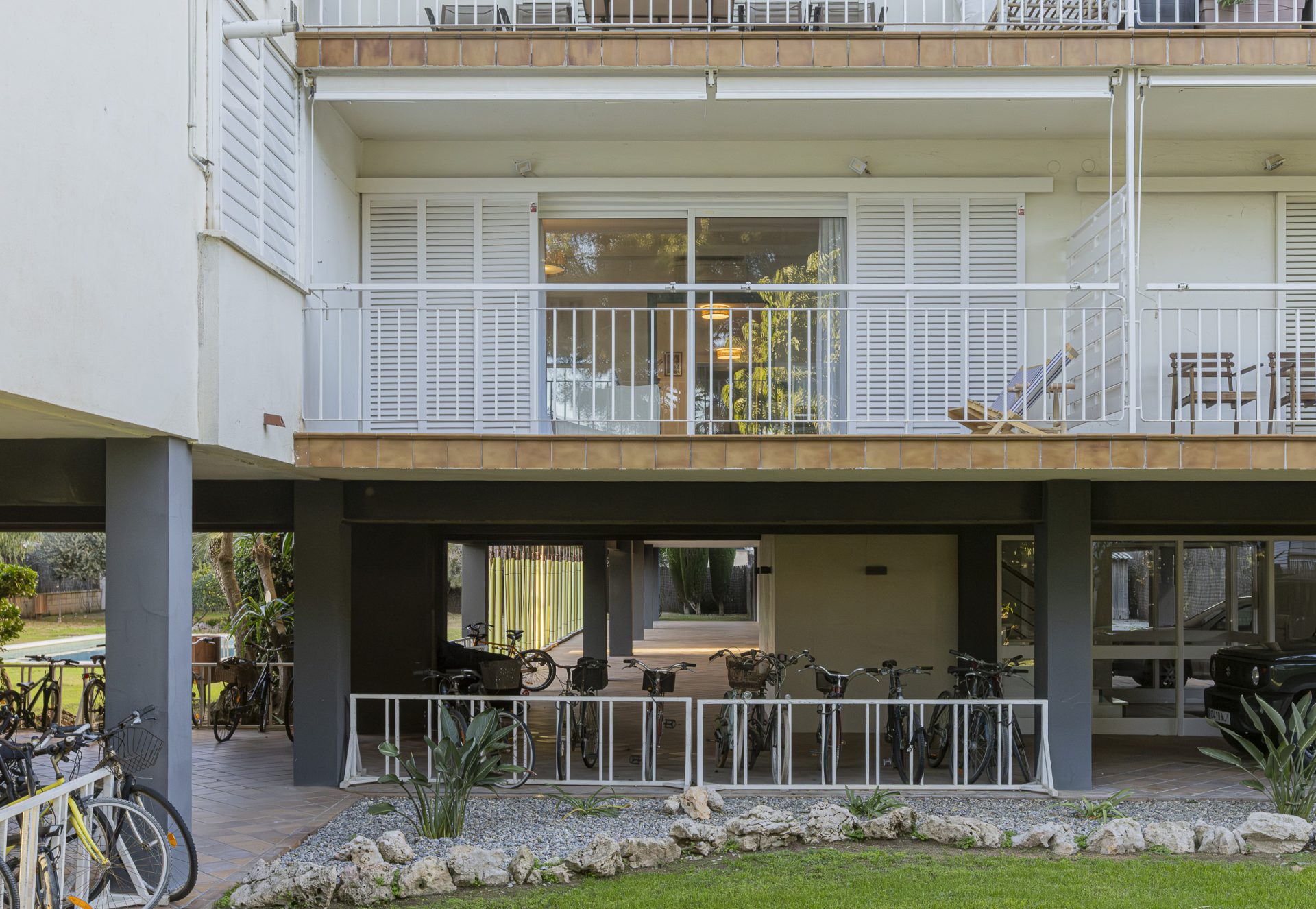 The building has a communal swimming pool surrounded by green areas and private parking.