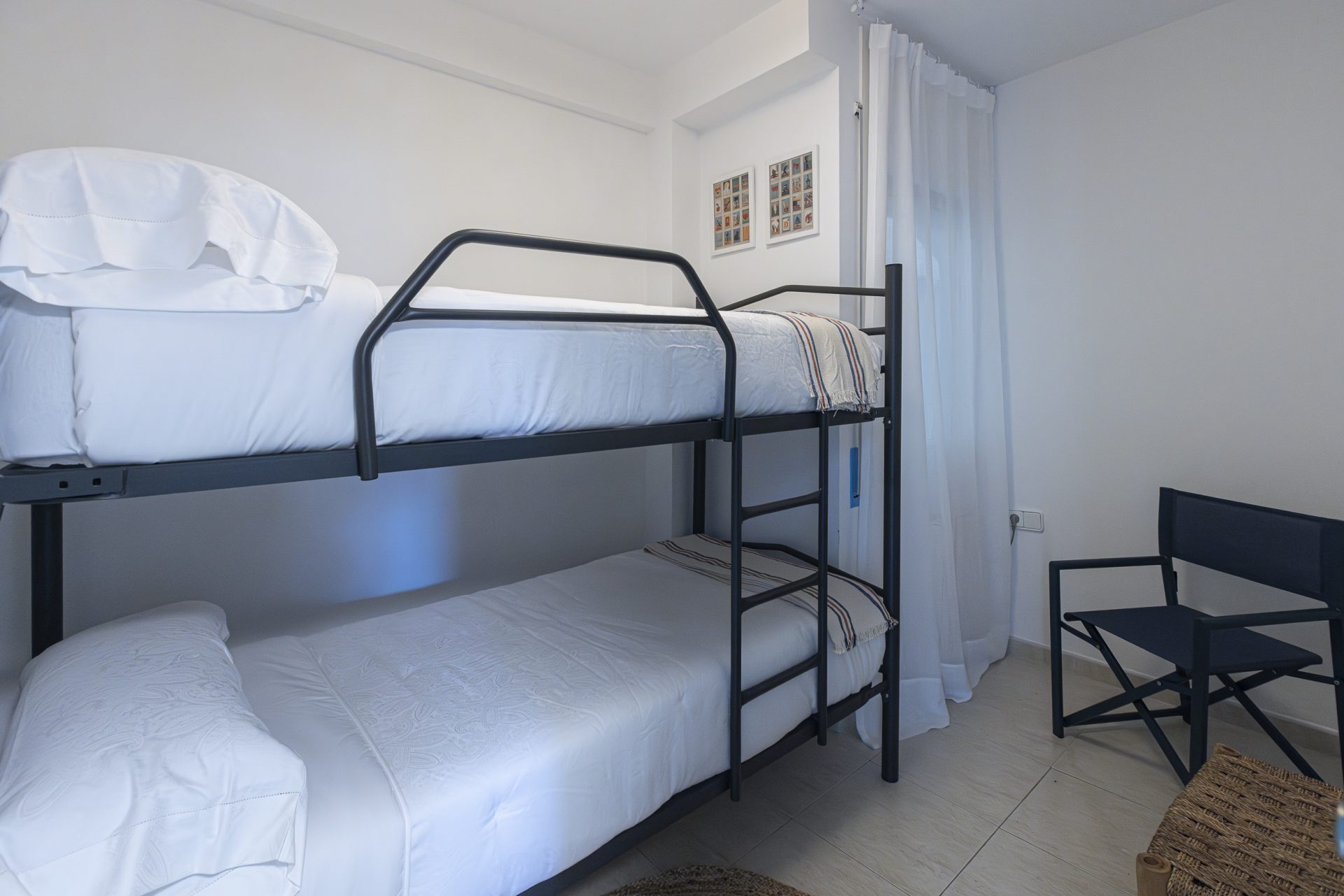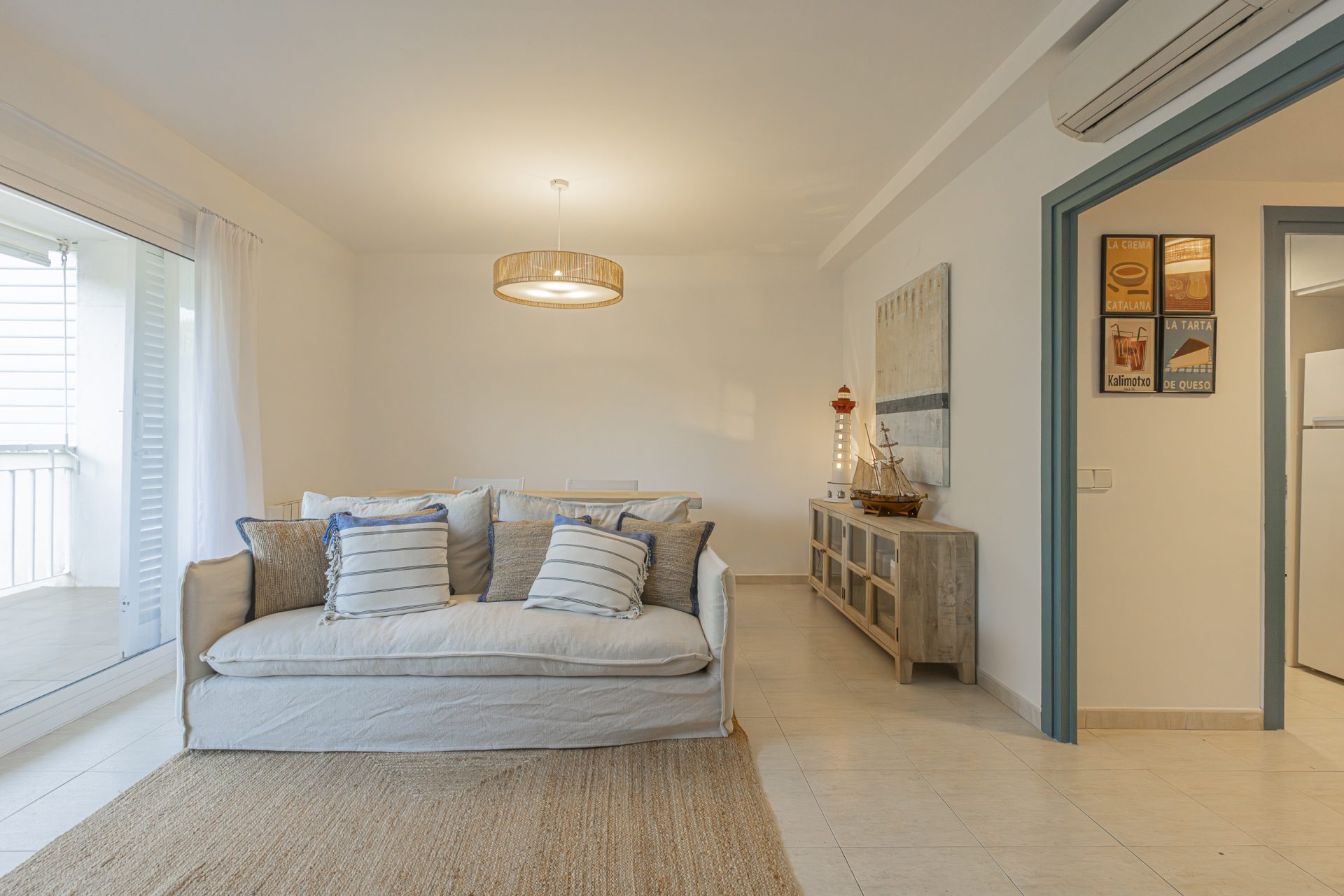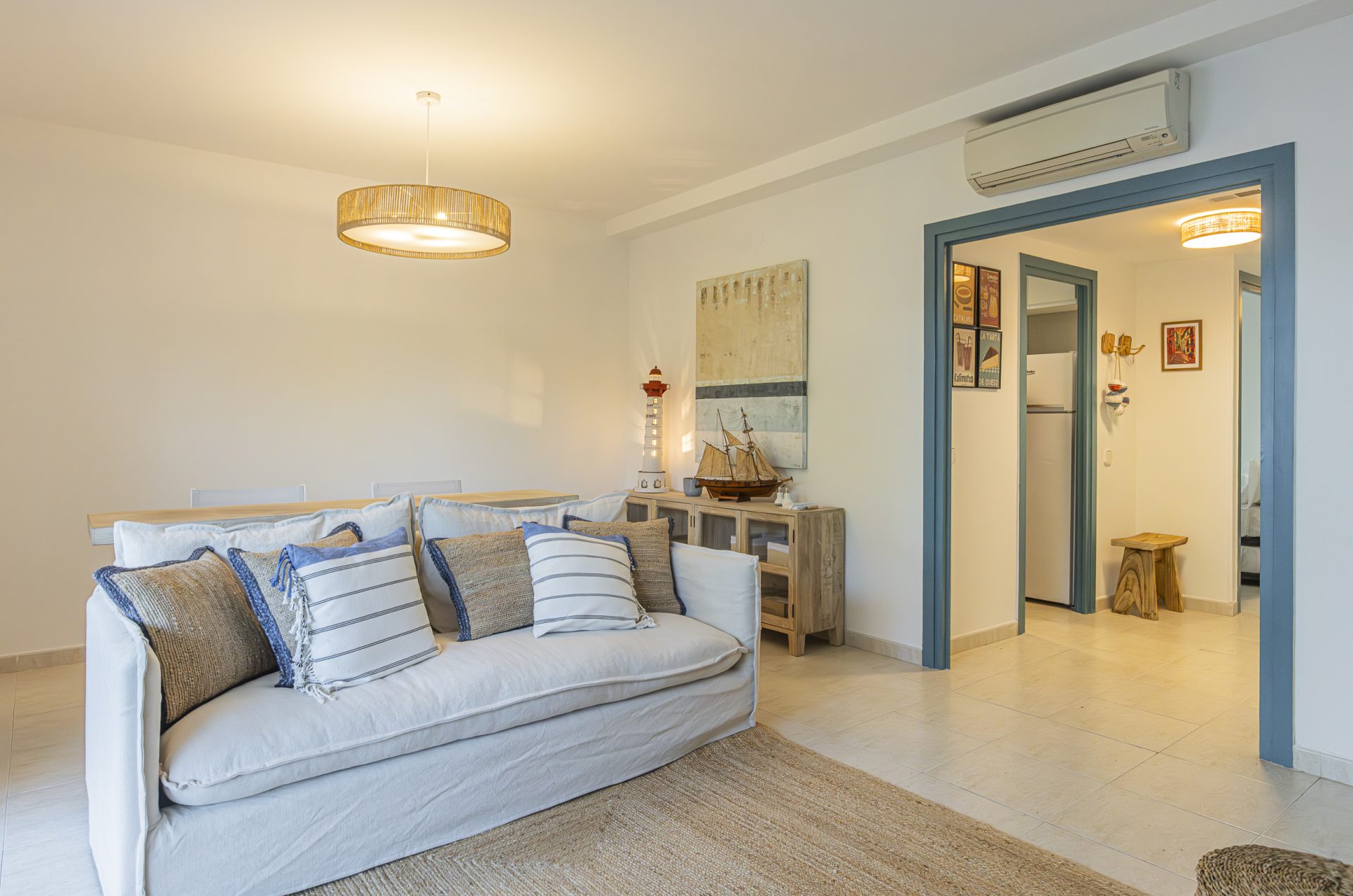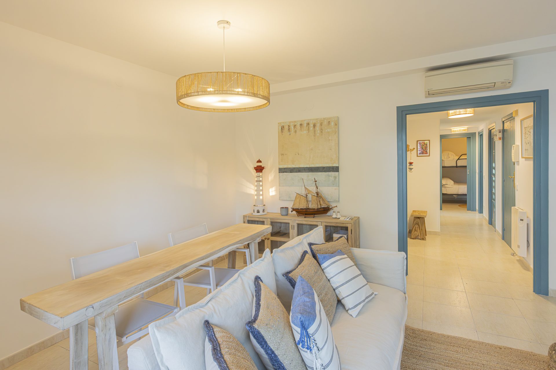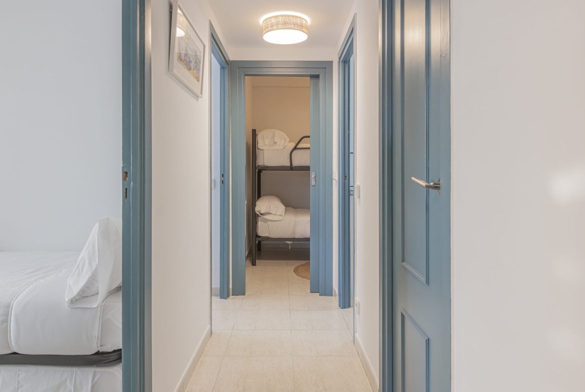 It has a separate kitchen, three bedrooms, one of which has access to a terrace, and two full bathrooms.
