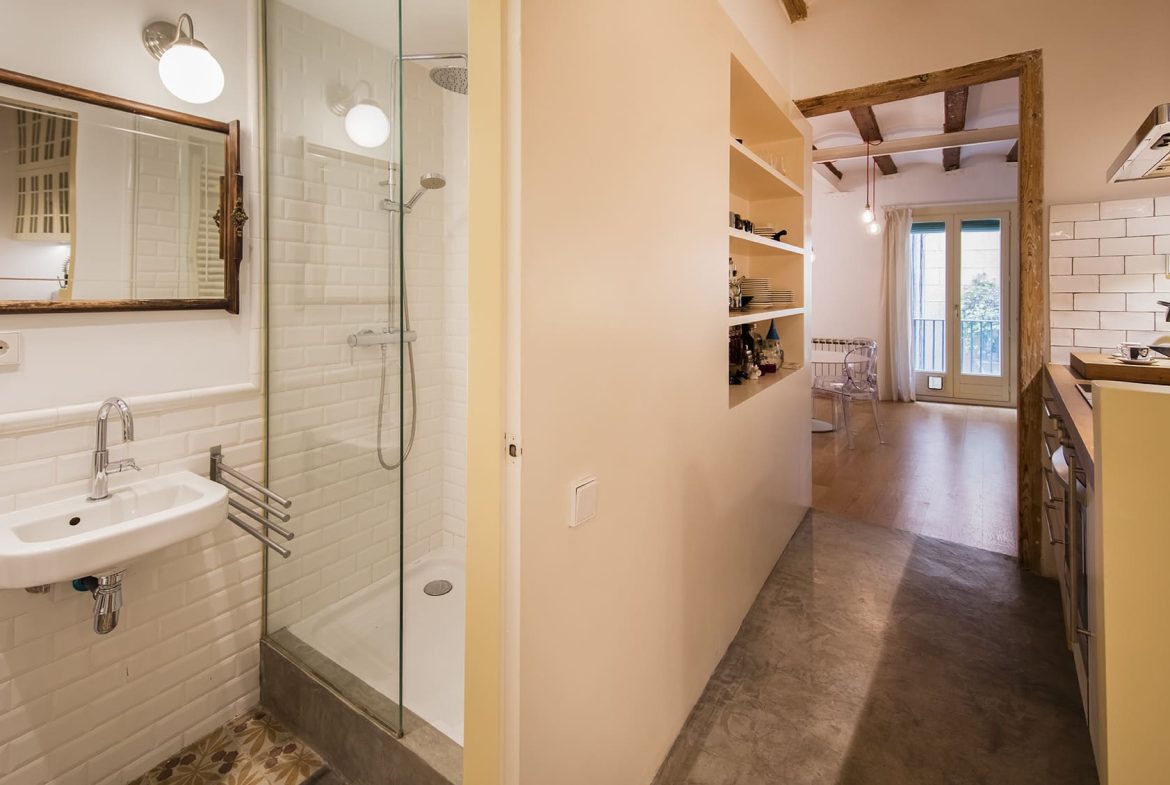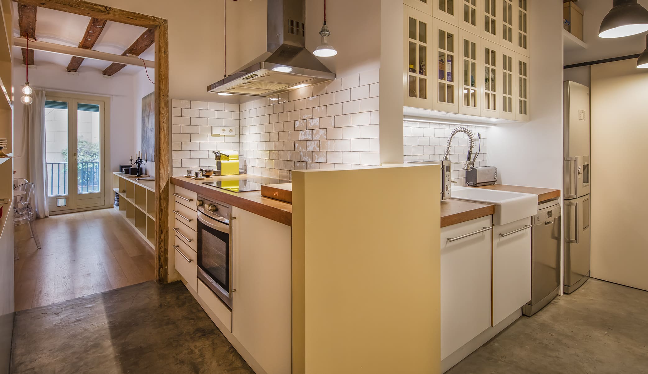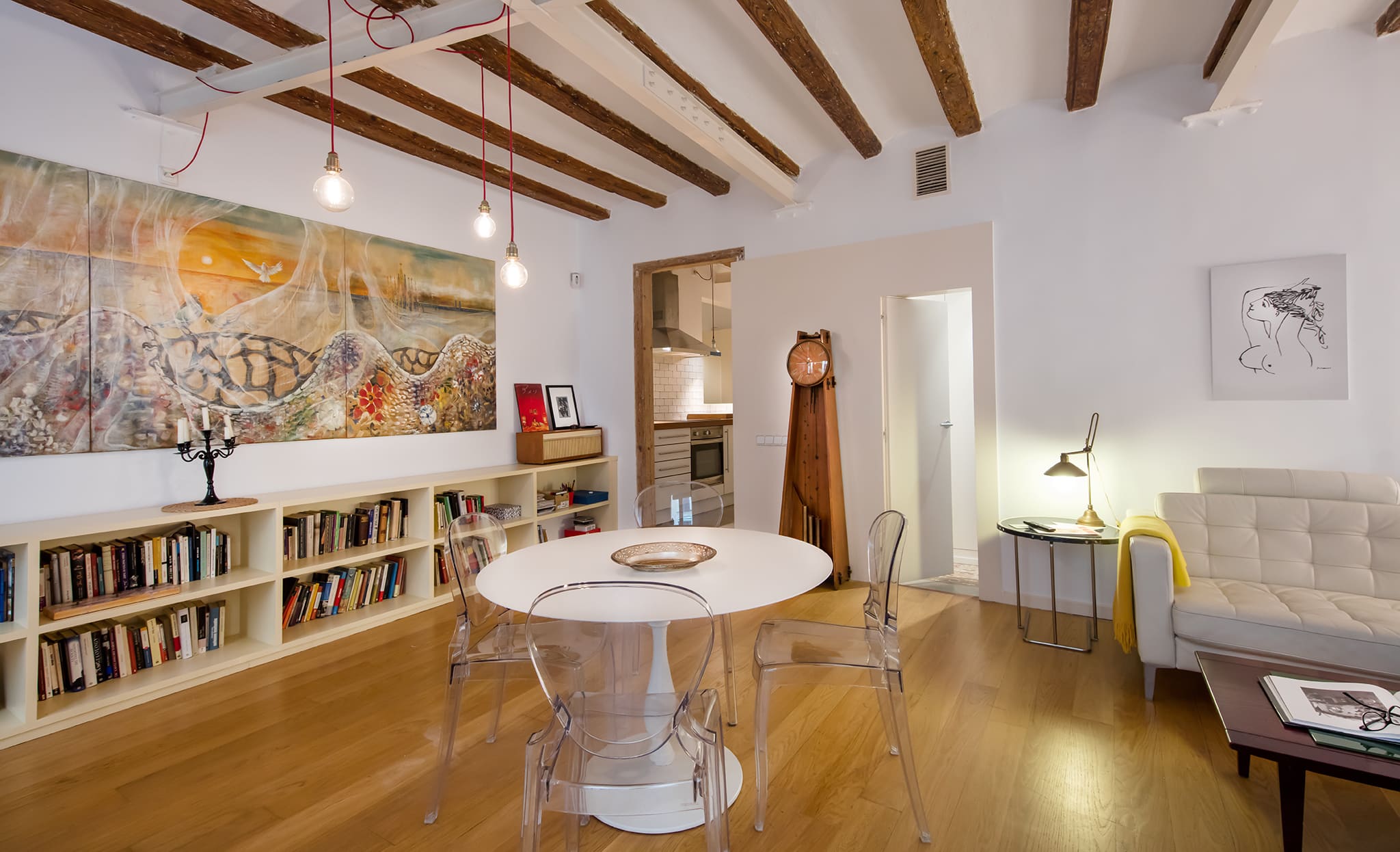El piso ha sido íntegramente reformado manteniendo y respetando elementos originales como las vigas de madera de los techos y suelos de mosaico originales combinados con parquet de madera y cemento pulido en cocina y baños. El resultado es una vivienda elegante, moderna y acogedora.