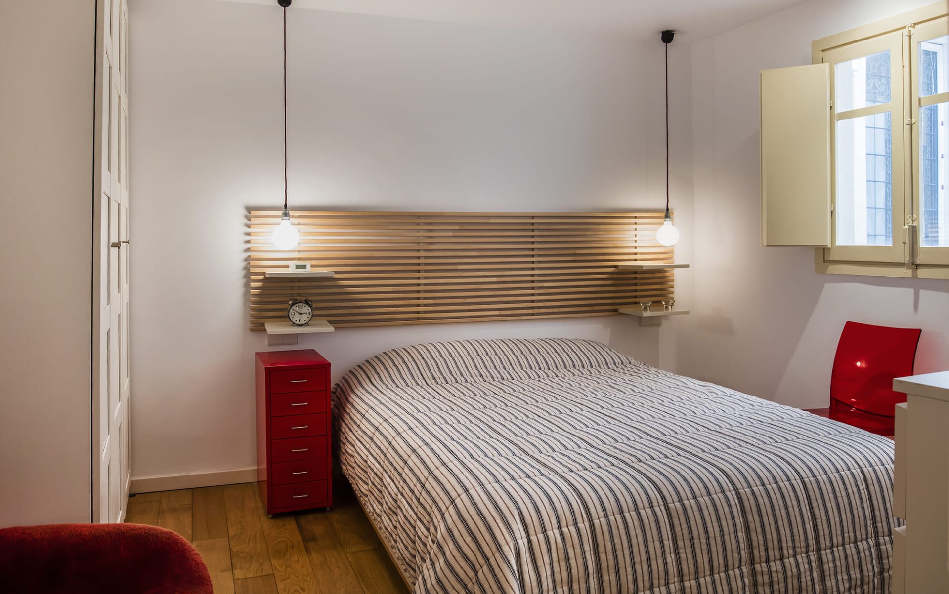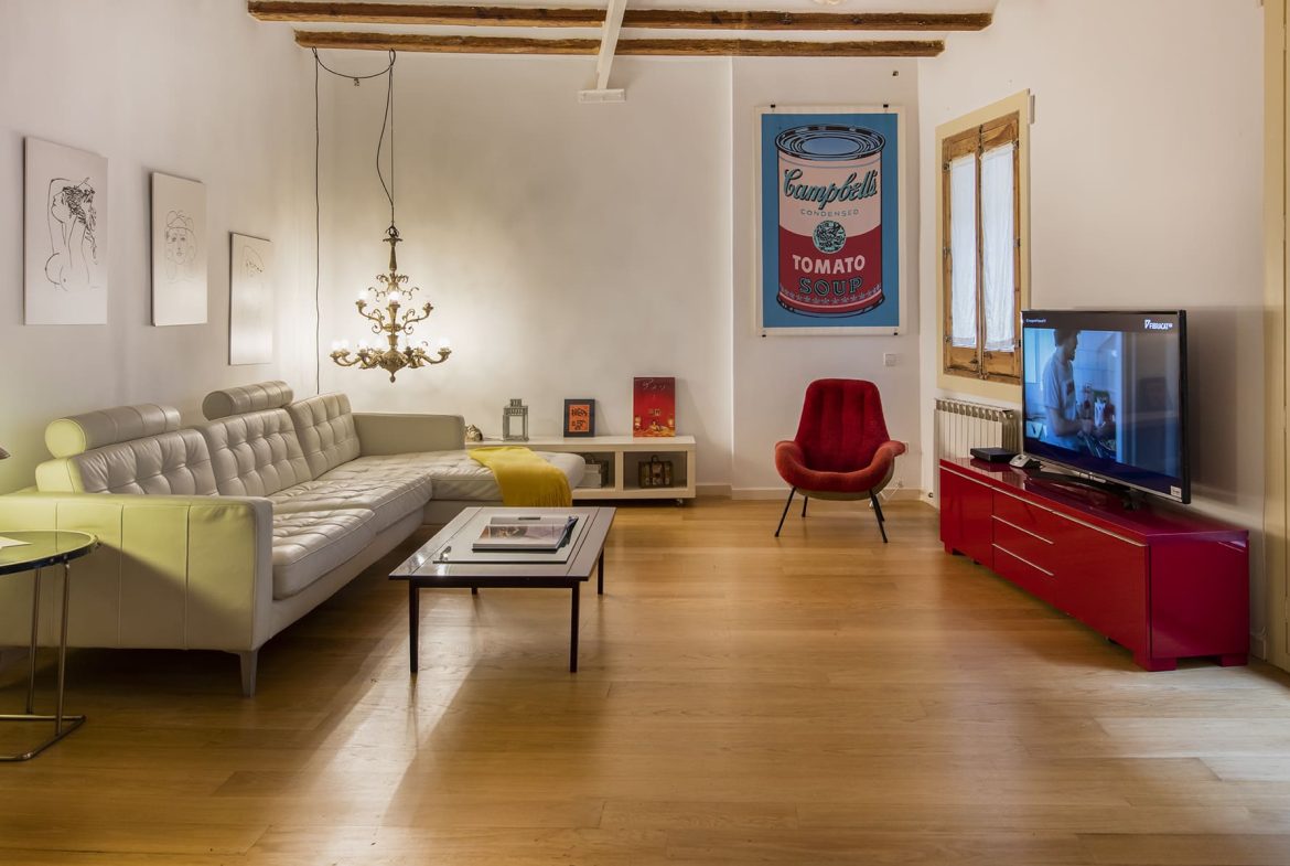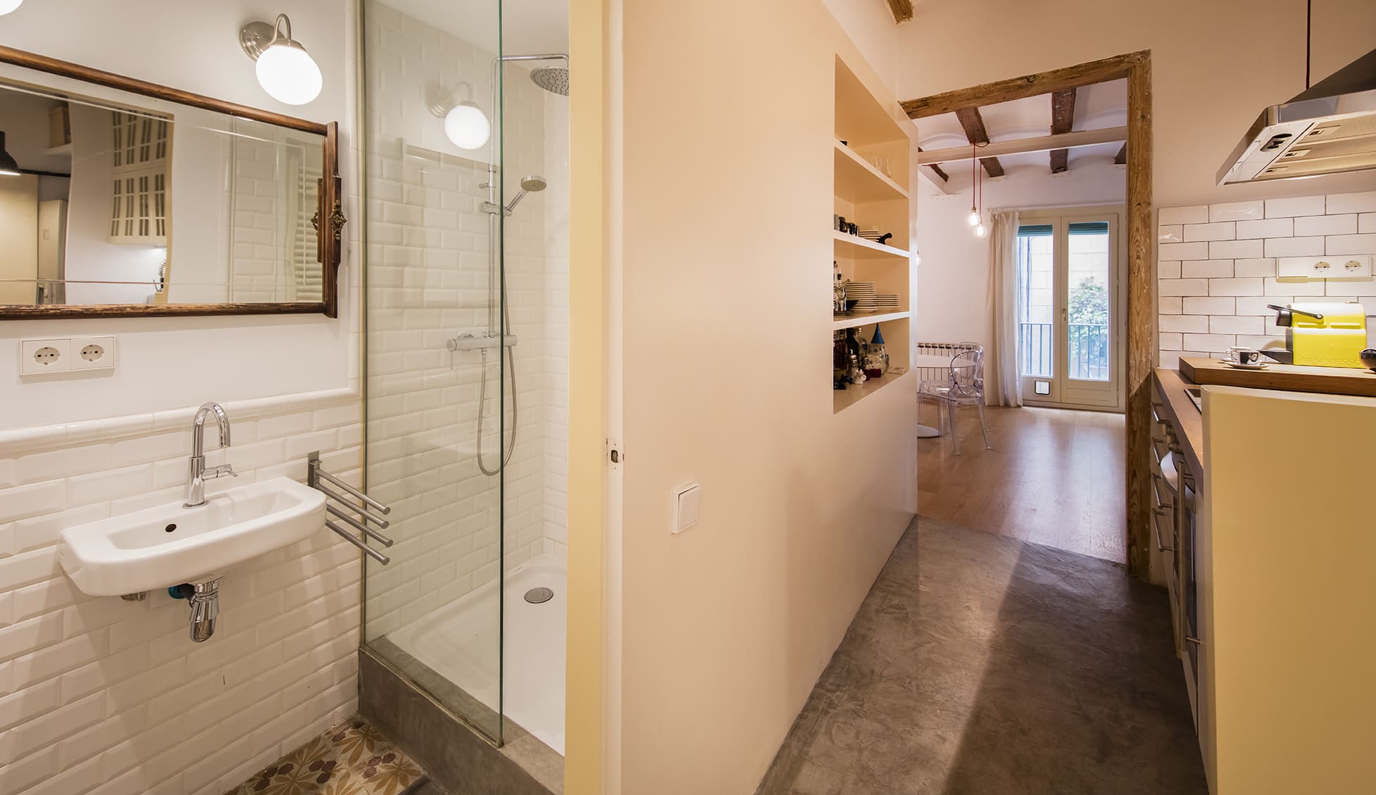 El piso ha sido íntegramente reformado manteniendo y respetando elementos originales como las vigas de madera de los techos y suelos de mosaico originales combinados con parquet de madera y cemento pulido en cocina y baños. El resultado es una vivienda elegante, moderna y acogedora.