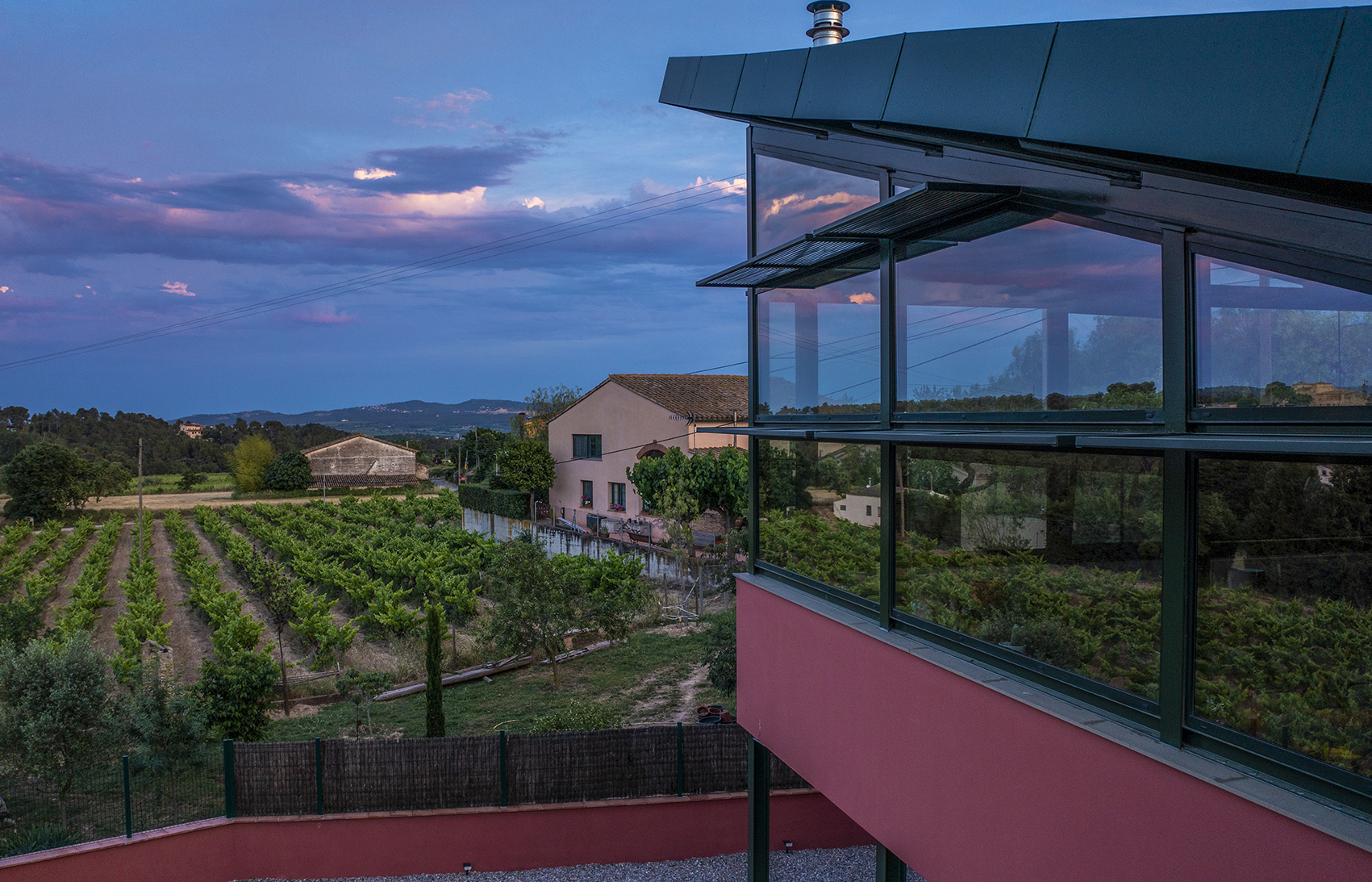 Desde el exterior, se destaca por su diseño, con líneas limpias, un doble tejado en dos niveles y una enorme fachada de cristal.
